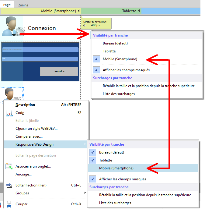 Astuce : l'ordre des champs les uns par rapport aux autres est figé dans toutes les tranches. Par contre, la visibilité des champs ainsi que leurs positions peuvent être surchargés. Dans un exemple comme ci-dessus, si l'on souhaite avoir dans une tranche un champ qui ne conserve pas sa position de référence définie par la tranche bureau, on peut utiliser deux champs et jouer sur leurs visibilités. Exemple pour avoir dans la tranche mobile une image placée avant le libellé "Connexion", alors qu'elle est après dans la tranche bureau :
